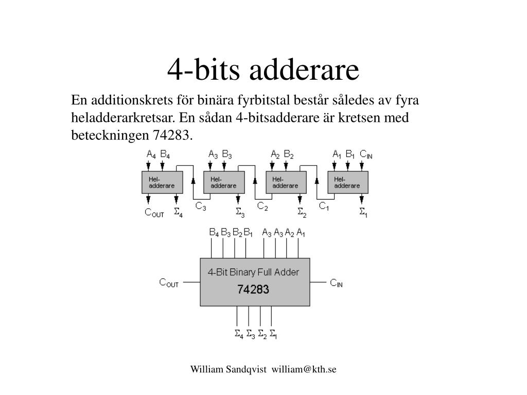 4-bits adderare En additionskrets för binära fyrbitstal består således av fyra heladderarkretsar. En sådan 4-bitsadderare är kretsen med beteckningen 74283. William Sandqvist william@kth.se