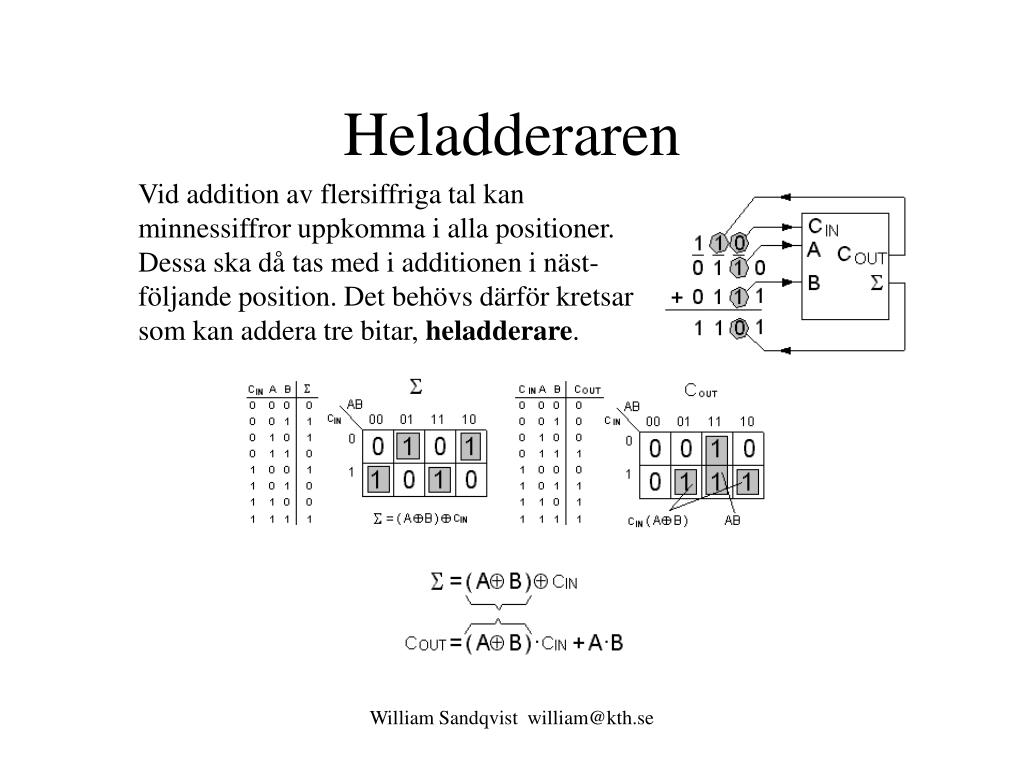 Heladderaren Vid addition av flersiffriga tal kan minnessiffror uppkomma i alla positioner. Dessa ska då tas med i additionen i näst-följande position. Det behövs därför kretsar som kan addera tre bitar, heladderare. William Sandqvist william@kth.se