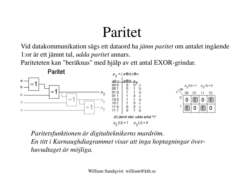 Paritet Vid datakommunikation sägs ett dataord ha jämn paritet om antalet ingående 1:or är ett jämnt tal, udda paritet annars. Pariteteten kan "beräknas" med hjälp av ett antal EXOR-grindar. Paritetsfunktionen är digitalteknikerns mardröm. En titt i Karnaughdiagrammet visar att inga hoptagningar över-huvudtaget är möjliga. William Sandqvist william@kth.se