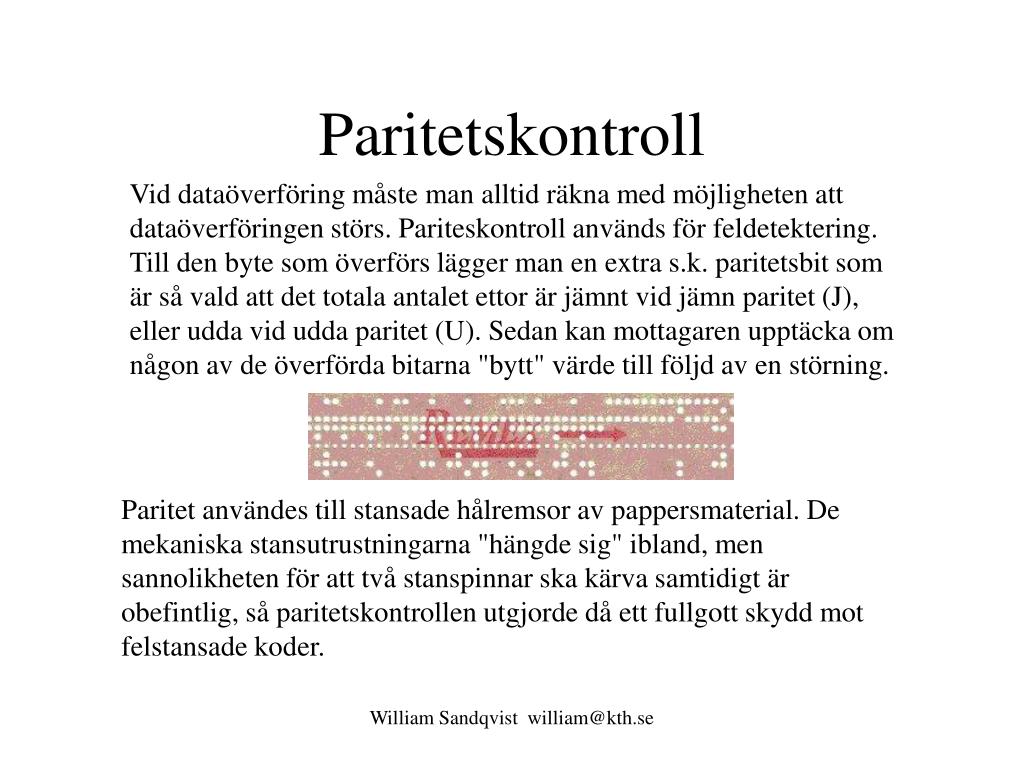 Paritetskontroll Vid dataöverföring måste man alltid räkna med möjligheten att dataöverföringen störs. Pariteskontroll används för feldetektering. Till den byte som överförs lägger man en extra s.k. paritetsbit som är så vald att det totala antalet ettor är jämnt vid jämn paritet (J), eller udda vid udda paritet (U). Sedan kan mottagaren upptäcka om någon av de överförda bitarna "bytt" värde till följd av en störning. Paritet användes till stansade hålremsor av pappersmaterial. De mekaniska stansutrustningarna "hängde sig" ibland, men sannolikheten för att två stanspinnar ska kärva samtidigt är obefintlig, så paritetskontrollen utgjorde då ett fullgott skydd mot felstansade koder. William Sandqvist william@kth.se