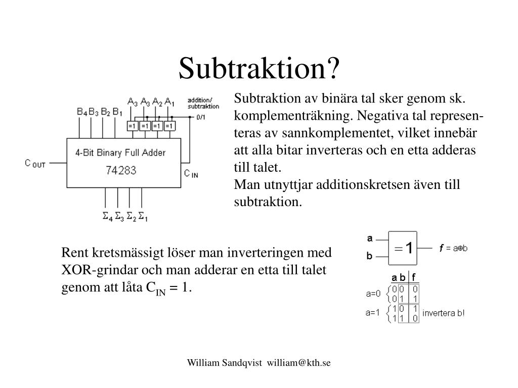 Subtraktion? Subtraktion av binära tal sker genom sk. komplementräkning. Negativa tal represen-teras av sannkomplementet, vilket innebär att alla bitar inverteras och en etta adderas till talet. Man utnyttjar additionskretsen även till subtraktion. Rent kretsmässigt löser man inverteringen med XOR-grindar och man adderar en etta till talet genom att låta CIN = 1. William Sandqvist william@kth.se