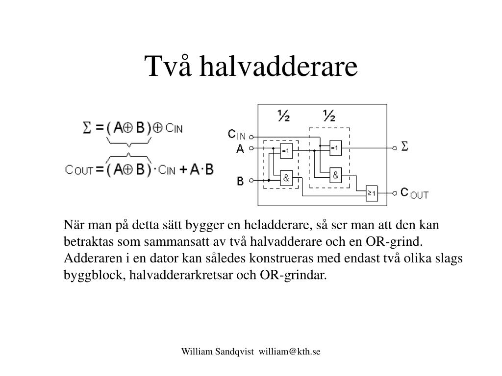 Två halvadderare När man på detta sätt bygger en heladderare, så ser man att den kan betraktas som sammansatt av två halvadderare och en OR-grind. Adderaren i en dator kan således konstrueras med endast två olika slags byggblock, halvadderarkretsar och OR-grindar. William Sandqvist william@kth.se