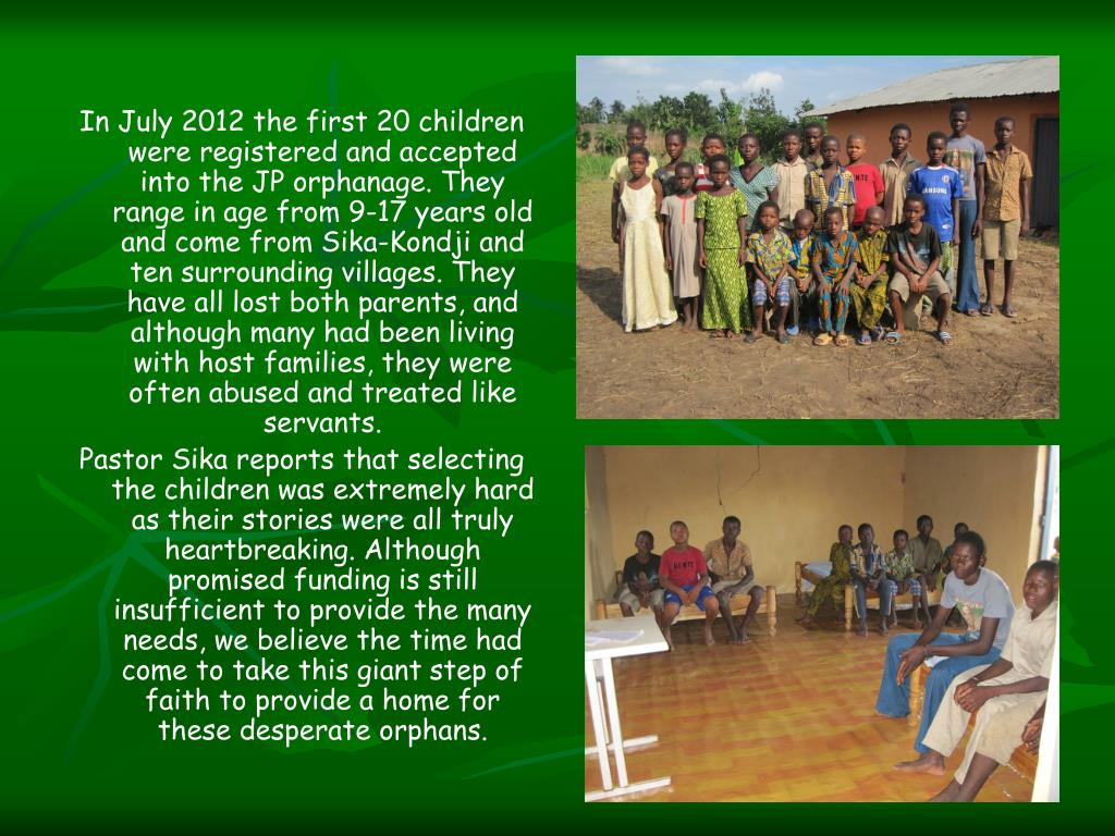 In July 2012 the first 20 children were registered and accepted into the JP orphanage. They range in age from 9-17 years old and come from Sika-Kondji and ten surrounding villages. They have all lost both parents, and although many had been living with host families, they were often abused and treated like servants. Pastor Sika reports that selecting the children was extremely hard as their stories were all truly heartbreaking. Although promised funding is still insufficient to provide the many needs, we believe the time had come to take this giant step of faith to provide a home for these desperate orphans.