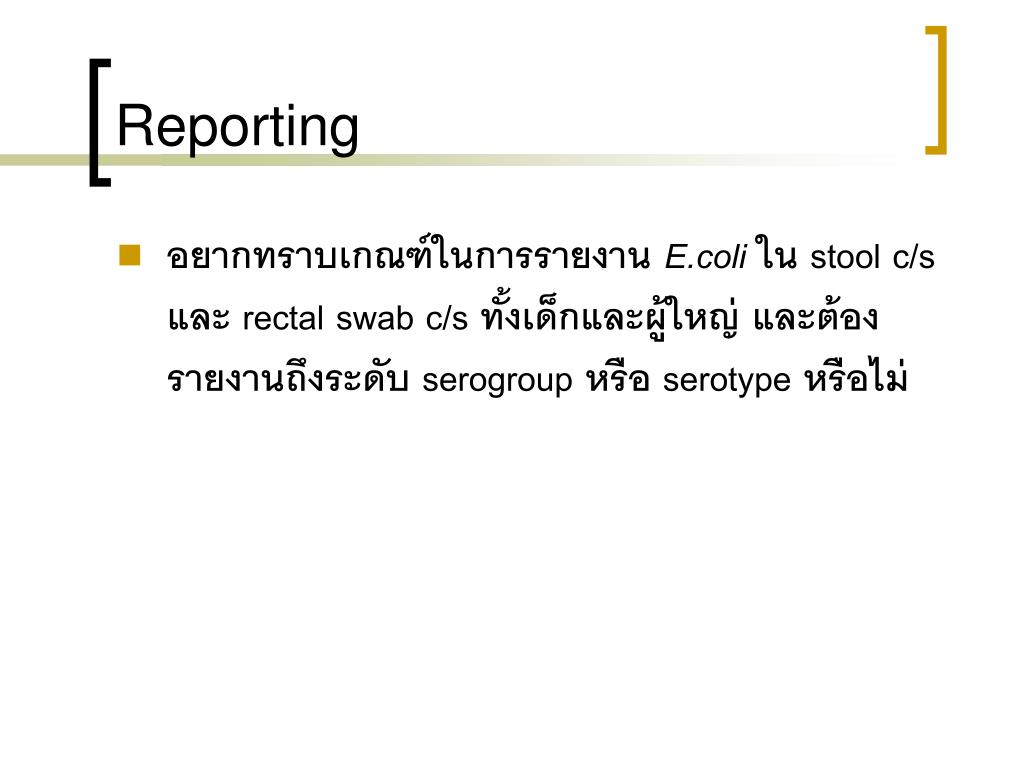 Reporting • อยากทราบเกณฑ์ในการรายงาน E.coli ใน stool c/s และ rectal swab c/s ทั้งเด็กและผู้ใหญ่ และต้องรายงานถึงระดับ serogroup หรือ serotype หรือไม่