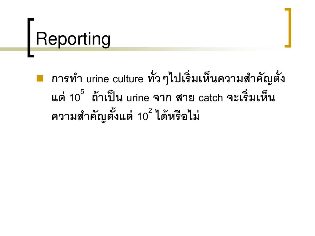 Reporting • การทำ urine culture ทั่วๆไปเริ่มเห็นความสำคัญตั่งแต่ 105 ถ้าเป็น urine จาก สาย catch จะเริ่มเห็นความสำคัญตั้งแต่ 102 ได้หรือไม่