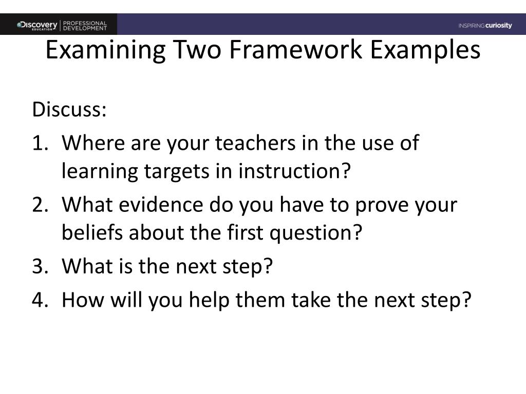 Examining Two Framework Examples Discuss: • Where are your teachers in the use of learning targets in instruction? • What evidence do you have to prove your beliefs about the first question? • What is the next step? • How will you help them take the next step?