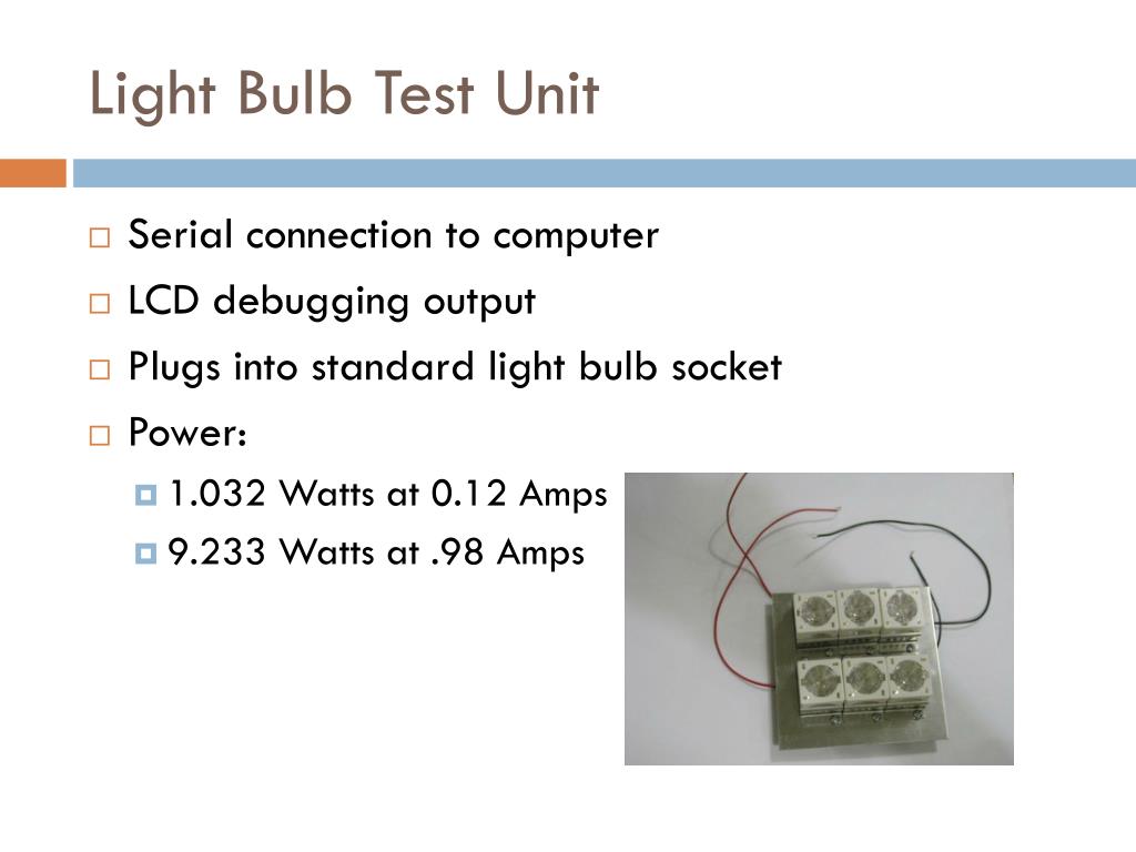 Light Bulb Test Unit • Serial connection to computer • LCD debugging output • Plugs into standard light bulb socket • Power: • 1.032 Watts at 0.12 Amps • 9.233 Watts at .98 Amps
