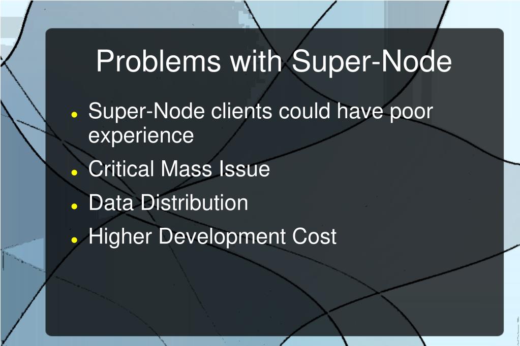 Problems with Super-Node • Super-Node clients could have poor experience • Critical Mass Issue • Data Distribution • Higher Development Cost