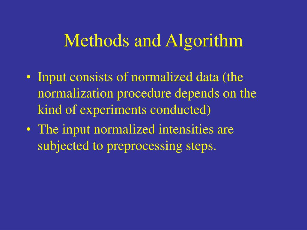 Methods and Algorithm • Input consists of normalized data (the normalization procedure depends on the kind of experiments conducted) • The input normalized intensities are subjected to preprocessing steps.