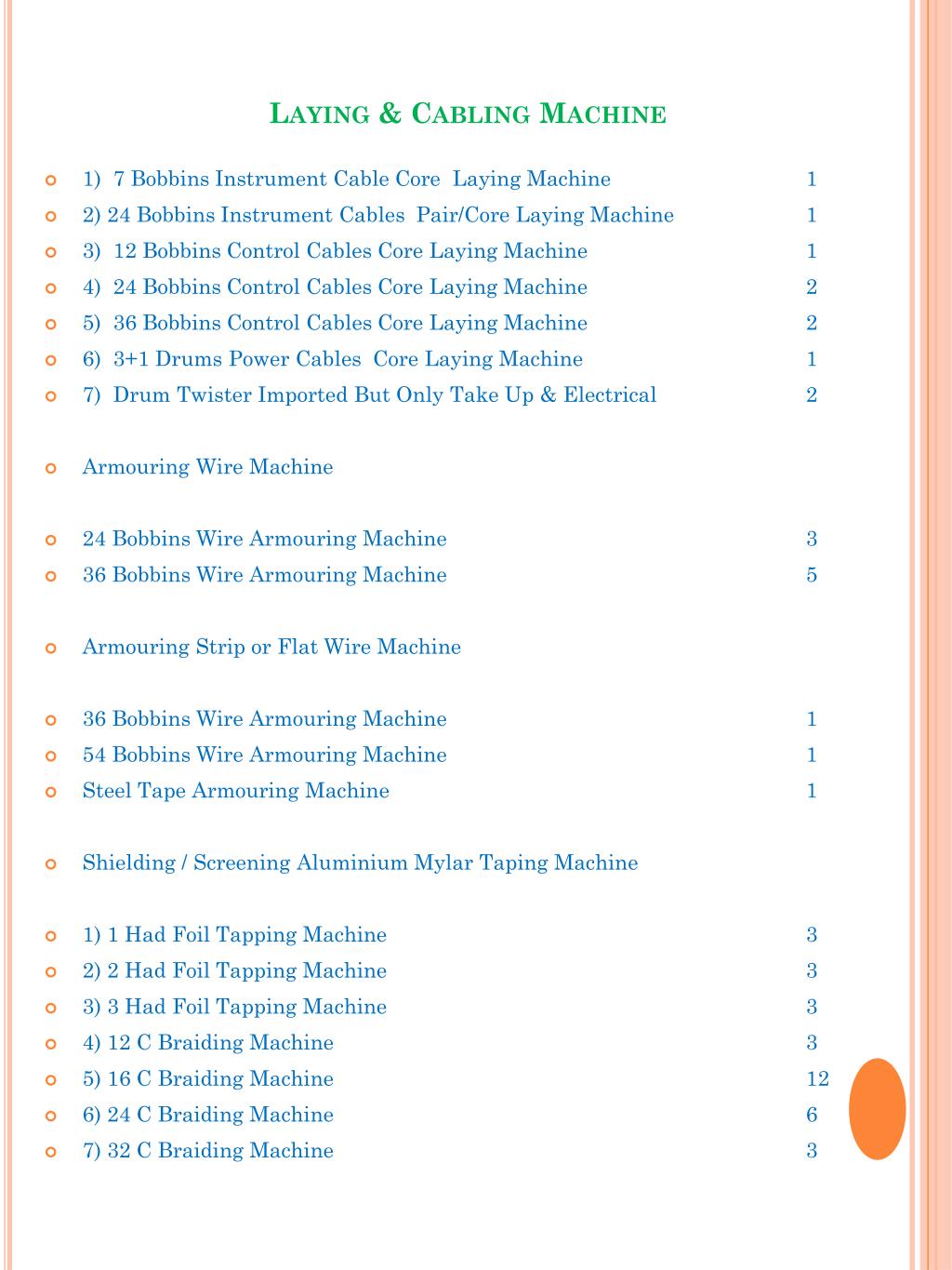 Laying & Cabling Machine • 1) 7 Bobbins Instrument Cable Core Laying Machine 1 • 2) 24 Bobbins Instrument Cables Pair/Core Laying Machine 1 • 3) 12 Bobbins Control Cables Core Laying Machine 1 • 4) 24 Bobbins Control Cables Core Laying Machine 2 • 5) 36 Bobbins Control Cables Core Laying Machine 2 • 6) 3+1 Drums Power Cables Core Laying Machine 1 • 7) Drum Twister Imported But Only Take Up & Electrical 2 • Armouring Wire Machine • 24 Bobbins Wire Armouring Machine 3 • 36 Bobbins Wire Armouring Machine 5 • Armouring Strip or Flat Wire Machine • 36 Bobbins Wire Armouring Machine 1 • 54 Bobbins Wire Armouring Machine 1 • Steel Tape Armouring Machine 1 • Shielding / Screening Aluminium Mylar Taping Machine • 1) 1 Had Foil Tapping Machine 3 • 2) 2 Had Foil Tapping Machine 3 • 3) 3 Had Foil Tapping Machine 3 • 4) 12 C Braiding Machine 3 • 5) 16 C Braiding Machine 12 • 6) 24 C Braiding Machine 6 • 7) 32 C Braiding Machine 3