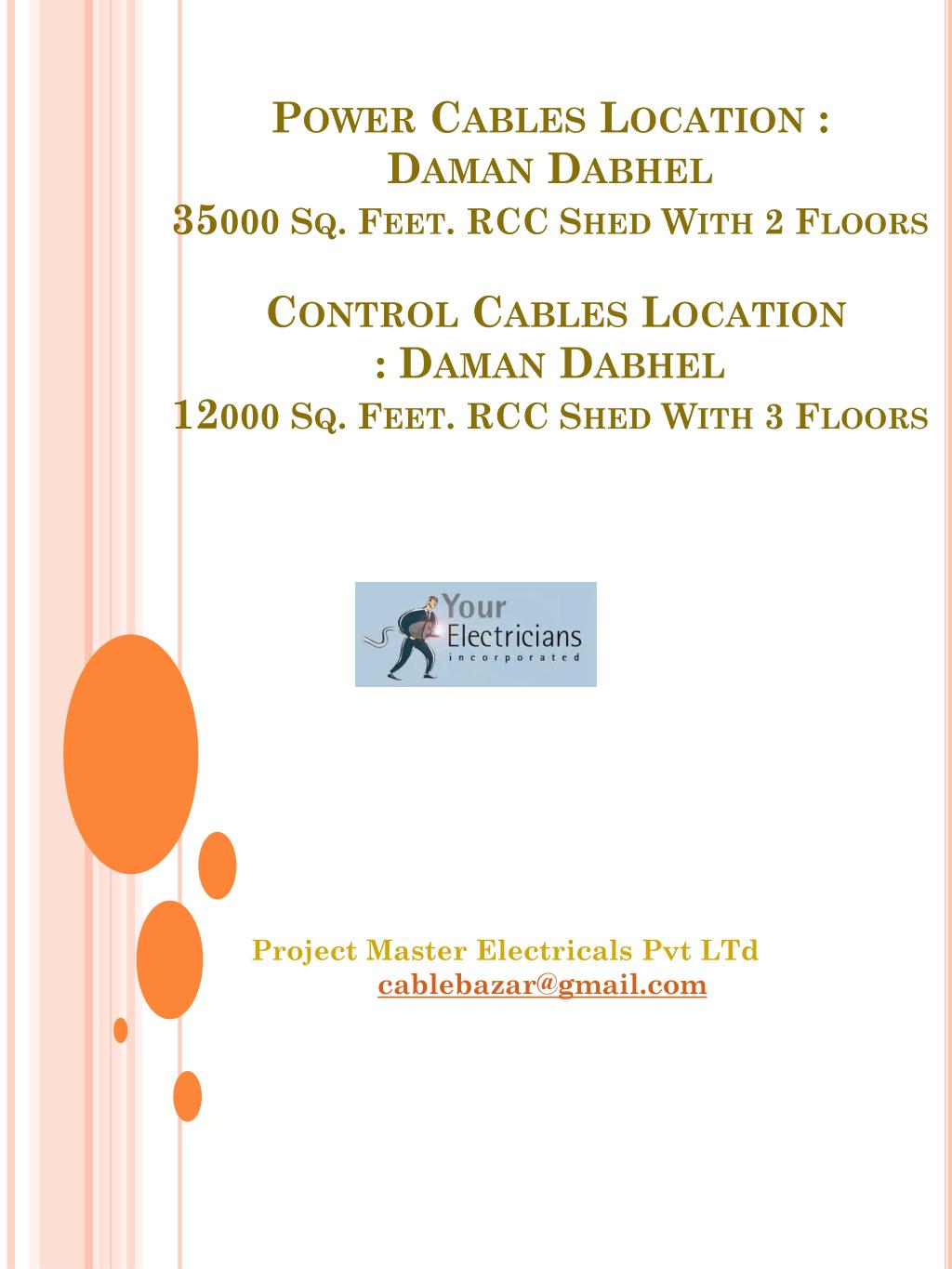 Power Cables Location : Daman Dabhel35000 Sq. Feet. RCC Shed With 2 FloorsControl Cables Location : Daman Dabhel12000 Sq. Feet. RCC Shed With 3 Floors Project Master Electricals Pvt LTdcablebazar@gmail.com