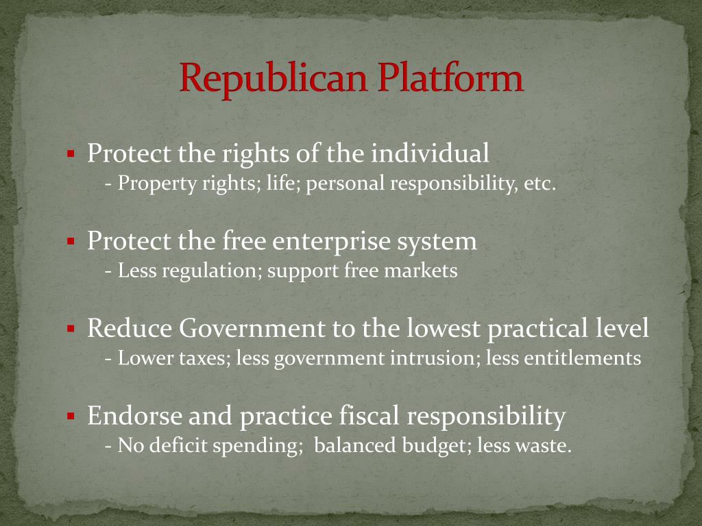 Republican Platform • Protect the rights of the individual - Property rights; life; personal responsibility, etc. • Protect the free enterprise system - Less regulation; support free markets • Reduce Government to the lowest practical level - Lower taxes; less government intrusion; less entitlements • Endorse and practice fiscal responsibility - No deficit spending; balanced budget; less waste.