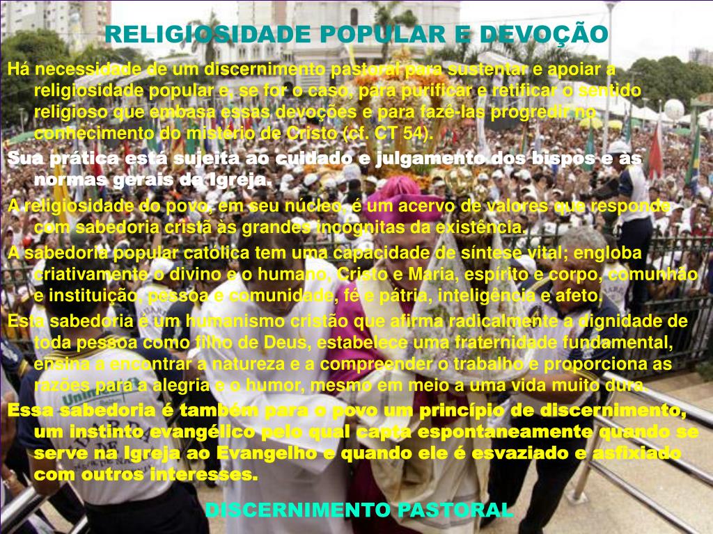 RELIGIOSIDADE POPULAR E DEVOÇÃO DISCERNIMENTO PASTORAL Há necessidade de um discernimento pastoral para sustentar e apoiar a religiosidade popular e, se for o caso, para purificar e retificar o sentido religioso que embasa essas devoções e para fazê-las progredir no conhecimento do mistério de Cristo (cf. CT 54). Sua prática está sujeita ao cuidado e julgamento dos bispos e às normas gerais da Igreja. A religiosidade do povo, em seu núcleo, é um acervo de valores que responde com sabedoria cristã às grandes incógnitas da existência. A sabedoria popular católica tem uma capacidade de síntese vital; engloba criativamente o divino e o humano, Cristo e Maria, espírito e corpo, comunhão e instituição, pessoa e comunidade, fé e pátria, inteligência e afeto. Esta sabedoria é um humanismo cristão que afirma radicalmente a dignidade de toda pessoa como filho de Deus, estabelece uma fraternidade fundamental, ensina a encontrar a natureza e a compreender o trabalho e proporciona as razões para a alegria e o humor, mesmo em meio a uma vida muito dura. Essa sabedoria é também para o povo um princípio de discernimento, um instinto evangélico pelo qual capta espontaneamente quando se serve na Igreja ao Evangelho e quando ele é esvaziado e asfixiado com outros interesses.