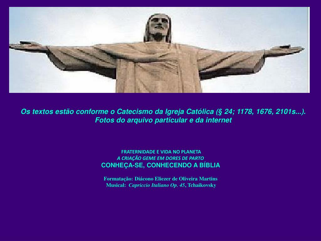 FRATERNIDADE E VIDA NO PLANETAA CRIAÇÃO GEME EM DORES DE PARTOCONHEÇA-SE, CONHECENDO A BÍBLIA Formatação: Diácono Eliezer de Oliveira Martins Musical: Capriccio Italiano Op. 45, Tchaikovsky Os textos estão conforme o Catecismo da Igreja Católica (§ 24; 1178, 1676, 2101s...). Fotos do arquivo particular e da internet