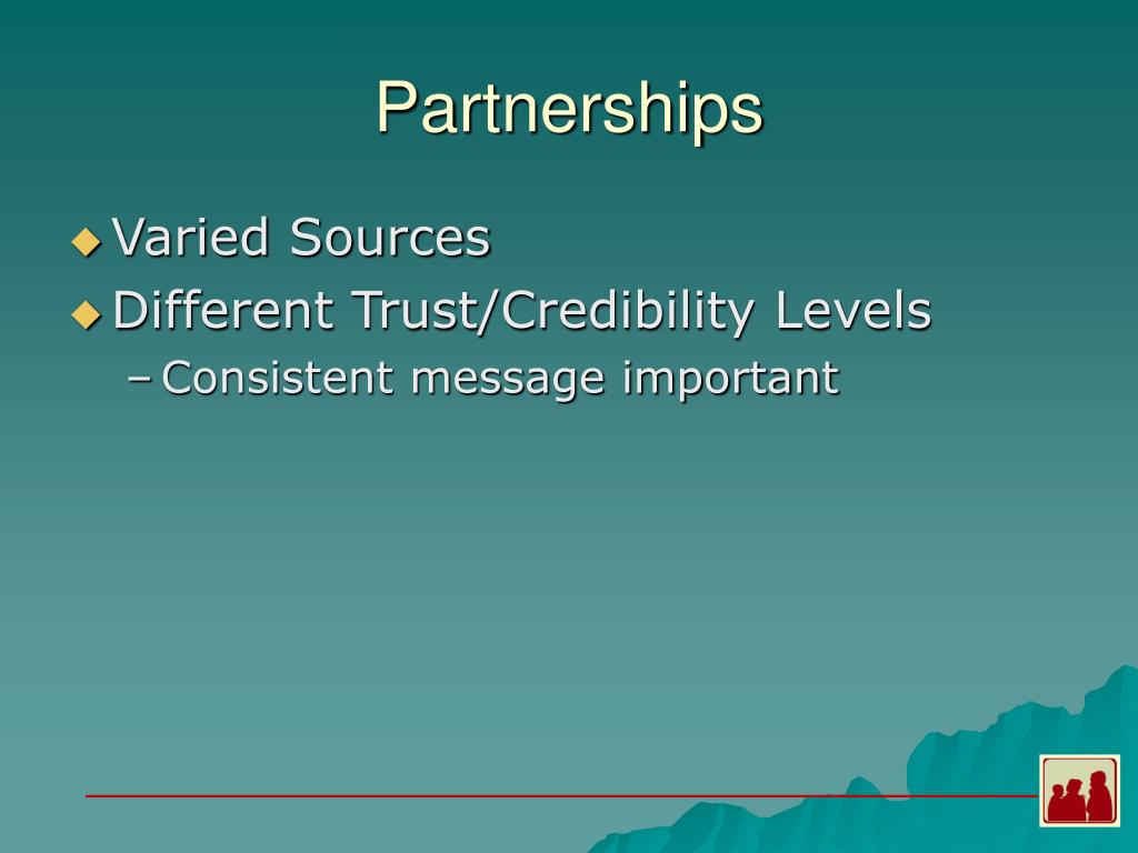 Partnerships • Varied Sources • Different Trust/Credibility Levels • Consistent message important