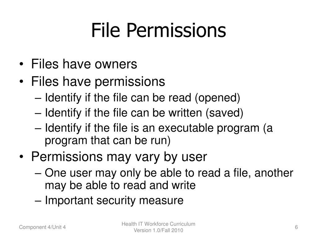 File Permissions • Files have owners • Files have permissions • Identify if the file can be read (opened) • Identify if the file can be written (saved) • Identify if the file is an executable program (a program that can be run) • Permissions may vary by user • One user may only be able to read a file, another may be able to read and write • Important security measure Health IT Workforce Curriculum Version 1.0/Fall 2010