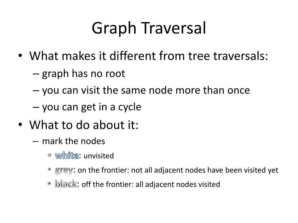 Graph Traversal • What makes it different from tree traversals: • graph has no root • you can visit the same node more than once • you can get in a cycle • What to do about it: • mark the nodes • white: unvisited • grey: on the frontier: not all adjacent nodes have been visited yet • black: off the frontier: all adjacent nodes visited