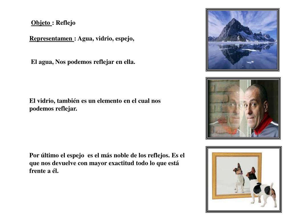 Objeto : Reflejo Representamen : Agua, vidrio, espejo, El agua, Nos podemos reflejar en ella.El vidrio, también es un elemento en el cual nos podemos reflejar.Por último el espejo es el más noble de los reflejos. Es el que nos devuelve con mayor exactitud todo lo que está frente a él.