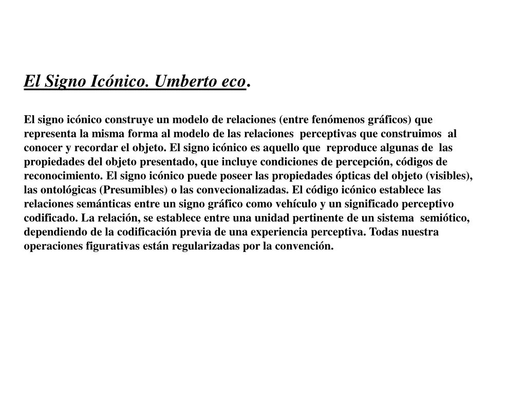 El Signo Icónico. Umberto eco.El signo icónico construye un modelo de relaciones (entre fenómenos gráficos) que representa la misma forma al modelo de las relaciones perceptivas que construimos al conocer y recordar el objeto. El signo icónico es aquello que reproduce algunas de las propiedades del objeto presentado, que incluye condiciones de percepción, códigos de reconocimiento. El signo icónico puede poseer las propiedades ópticas del objeto (visibles), las ontológicas (Presumibles) o las convecionalizadas. El código icónico establece las relaciones semánticas entre un signo gráfico como vehículo y un significado perceptivo codificado. La relación, se establece entre una unidad pertinente de un sistema semiótico, dependiendo de la codificación previa de una experiencia perceptiva. Todas nuestra operaciones figurativas están regularizadas por la convención.