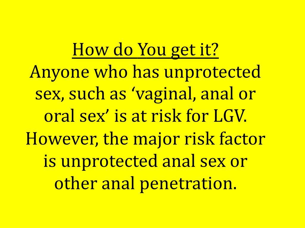 How do You get it? Anyone who has unprotected sex, such as ‘vaginal, anal or oral sex’ is at risk for LGV. However, the major risk factor is unprotected anal sex or other anal penetration.