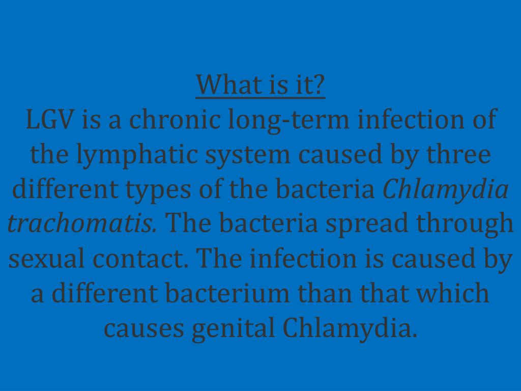 What is it? LGV is a chronic long-term infection of the lymphatic system caused by three different types of the bacteria Chlamydia trachomatis.The bacteria spread through sexual contact. The infection is caused by a different bacterium than that which causes genital Chlamydia.