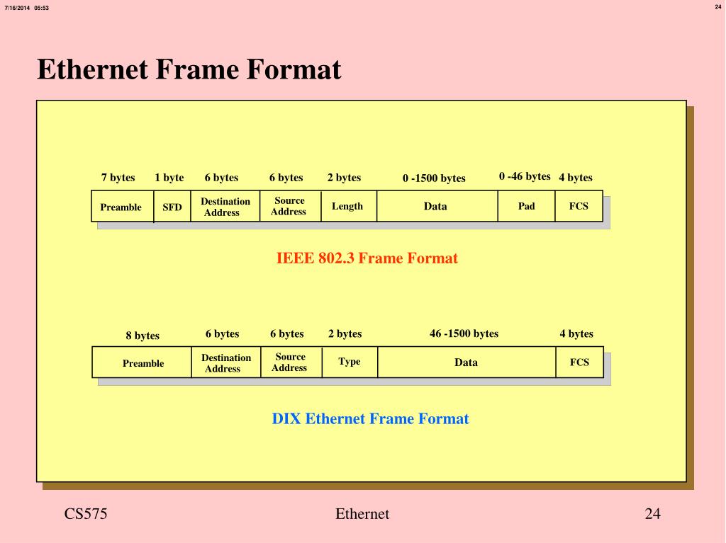 0 -46 bytes 7 bytes 1 byte 6 bytes 6 bytes 2 bytes 4 bytes 0 -1500 bytes Source Address Destination Address Data Length Pad FCS Preamble SFD Ethernet Frame Format IEEE 802.3 Frame Format 46 -1500 bytes 6 bytes 6 bytes 2 bytes 4 bytes 8 bytes Source Address Destination Address Type Data FCS Preamble DIX Ethernet Frame Format Ethernet