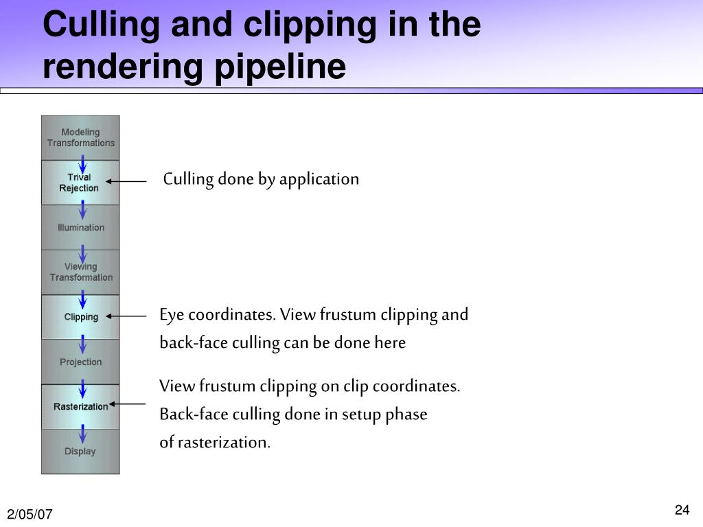 Culling and clipping in therendering pipeline Culling done by application Eye coordinates. View frustum clipping andback-face culling can be done here View frustum clipping on clip coordinates.Back-face culling done in setup phaseof rasterization.