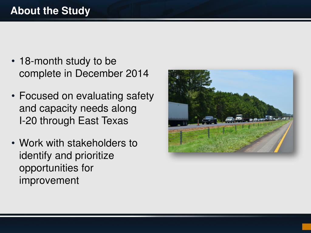 I-20 East Texas Corridor STUDY. Community Presentation. About the Study. 18-month study to be complete in December 2014 Focused on evaluating safety and capacity needs along I-20 through East Texas Work with stakeholders to identify and prioritize opportunities for improvement.