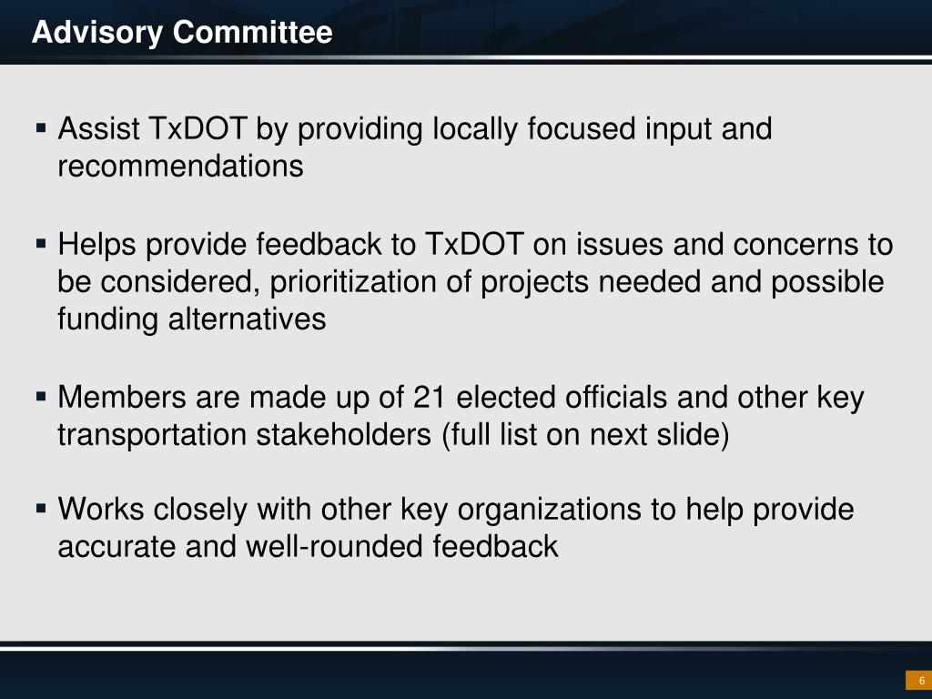 Advisory Committee • Assist TxDOT by providing locally focused input and recommendations • Helps provide feedback to TxDOT on issues and concerns to be considered, prioritization of projects needed and possible funding alternatives • Members are made up of 21 elected officials and other key transportation stakeholders (full list on next slide) • Works closely with other key organizations to help provide accurate and well-rounded feedback