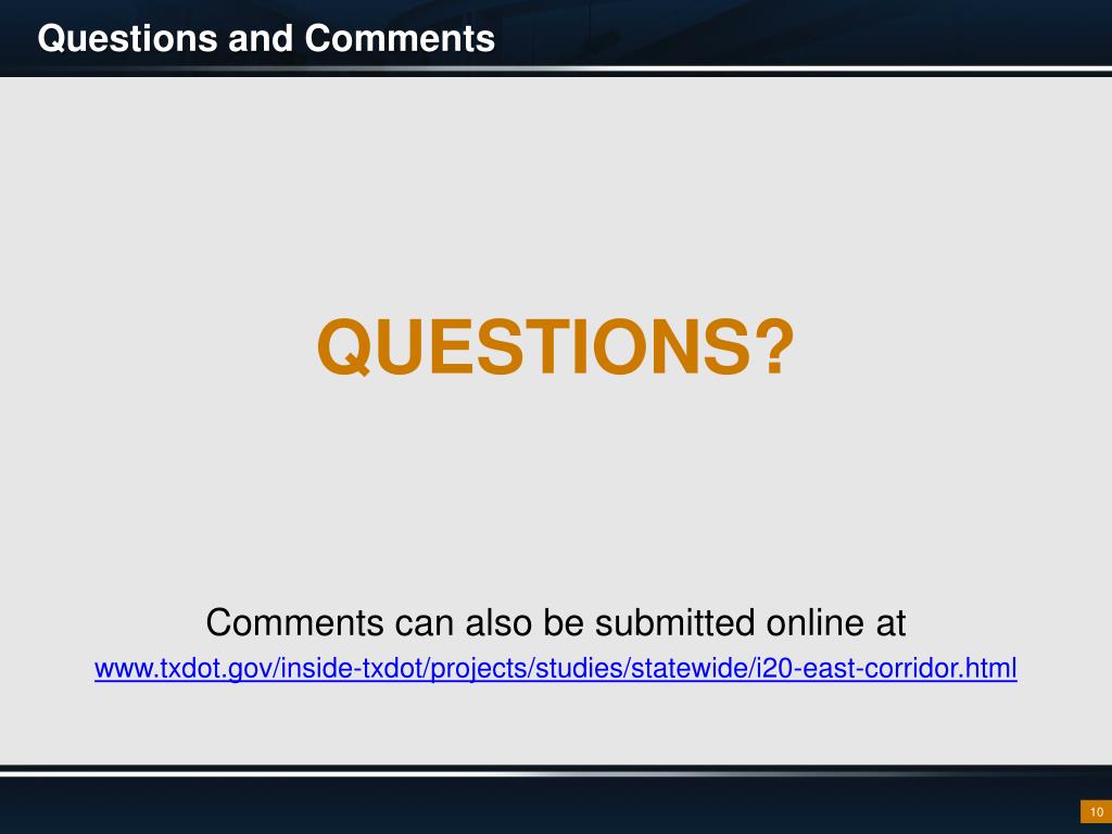 Questions and Comments QUESTIONS? Comments can also be submitted online at www.txdot.gov/inside-txdot/projects/studies/statewide/i20-east-corridor.html