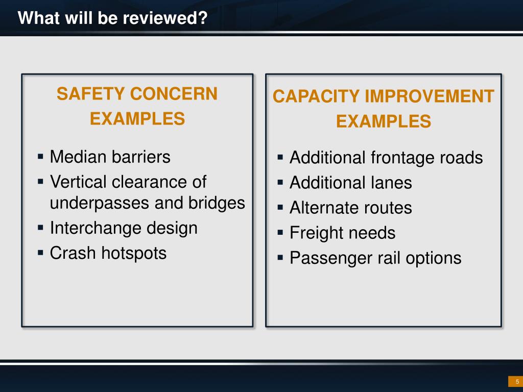 What will be reviewed? SAFETY CONCERN EXAMPLES CAPACITY IMPROVEMENT EXAMPLES • Median barriers • Vertical clearance of underpasses and bridges • Interchange design • Crash hotspots • Additional frontage roads • Additional lanes • Alternate routes • Freight needs • Passenger rail options