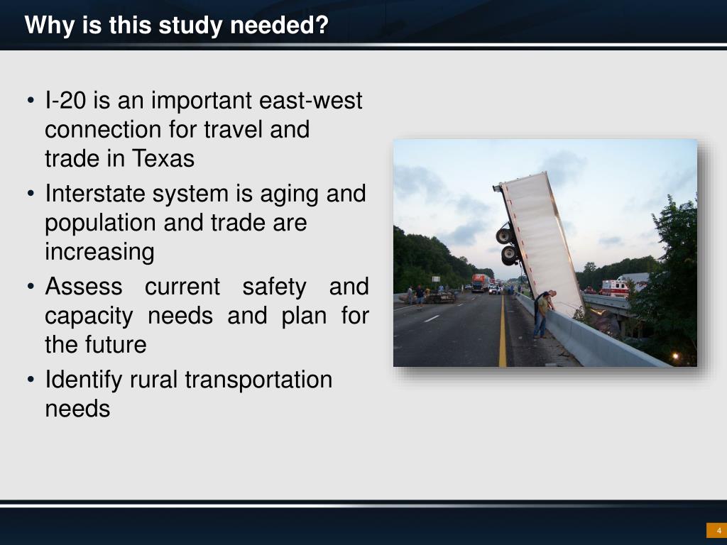 Why is this study needed? • I-20 is an important east-west connection for travel and trade in Texas • Interstate system is aging and population and trade are increasing • Assess current safety and capacity needs and plan for the future • Identify rural transportation needs