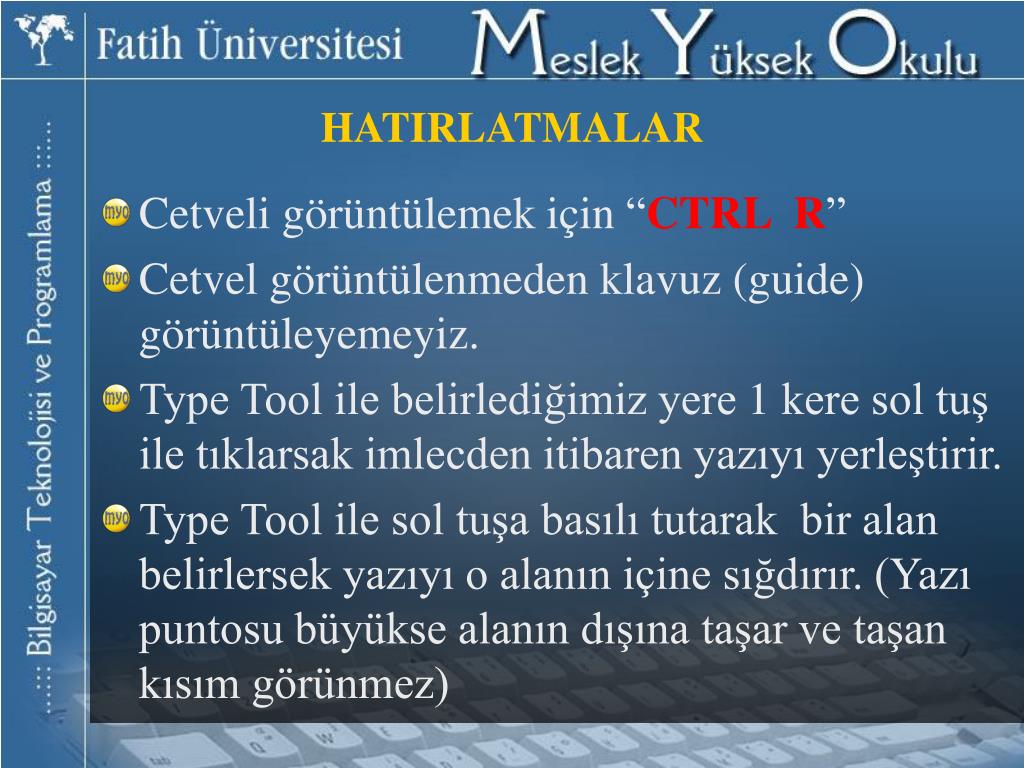 HATIRLATMALAR • Cetveli görüntülemek için “CTRL R” • Cetvel görüntülenmeden klavuz (guide) görüntüleyemeyiz. • Type Tool ile belirlediğimiz yere 1 kere sol tuş ile tıklarsak imlecden itibaren yazıyı yerleştirir. • Type Tool ile sol tuşa basılı tutarak bir alan belirlersek yazıyı o alanın içine sığdırır. (Yazı puntosu büyükse alanın dışına taşar ve taşan kısım görünmez)