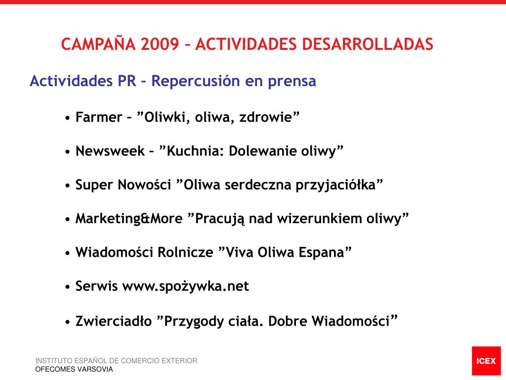 CAMPAÑA 2009 – ACTIVIDADES DESARROLLADAS Actividades PR – Medios de Comunicación e Importadores • TVP 1 • TV Biznes • Gazeta Wyborcza • Samo Zdrowie • Agrotechnika • Twoje Dziecko • Pani Domu Poleca • Metro • Wiadomości Handlowe • Marketing&More • Magazyn PRESS • Rynek Podróży • Zdrowie • Eden • Kuchnia • Galeria Style i Smaki • Żyjmy Dłużej • Voyage • Żyj Zdrowo • Fresh&Cool Market • Serwis Gabi.net • Shape • Reader's Digest • Agencja Colpisa • Phoenix Press • Hiszpańska Agencja Prasowa EFE • Nazdrowie • Jks • Sralgast • Dorapol • POL-ES Group • Marimax