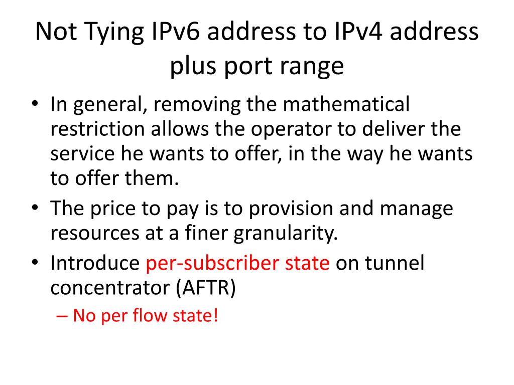 Not Tying IPv6 address to IPv4 address plus port range • In general, removing the mathematical restriction allows the operator to deliver the service he wants to offer, in the way he wants to offer them. • The price to pay is to provision and manage resources at a finer granularity. • Introduce per-subscriber state on tunnel concentrator (AFTR) • No per flow state!