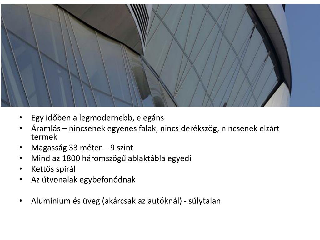 Egy időben a legmodernebb, elegáns • Áramlás – nincsenek egyenes falak, nincs derékszög, nincsenek elzárt termek • Magasság 33 méter – 9 szint • Mind az 1800 háromszögű ablaktábla egyedi • Kettős spirál • Az útvonalak egybefonódnak • Alumínium és üveg (akárcsak az autóknál) - súlytalan