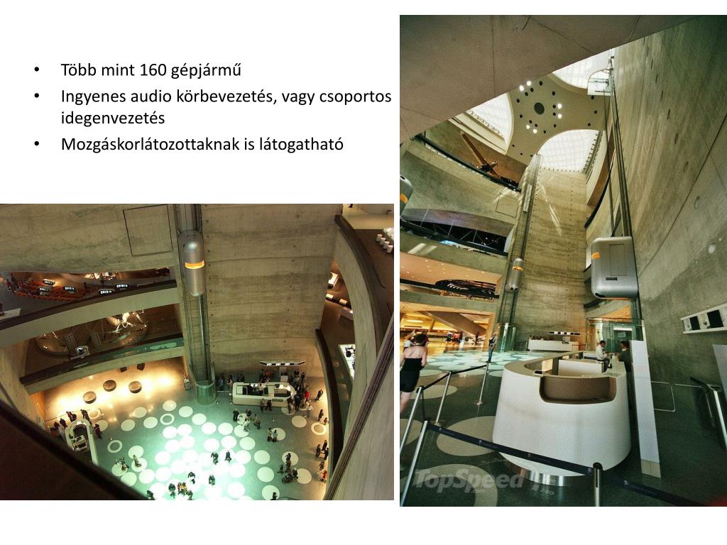a márka különböző kategóriájú egyéb modelljei, buszok, taxik, teherautók, pályaversenyautók, a Formula 1-ben szereplő eddigi összes évjárata: az Ezüst Nyilak több, mint fél évszázada. A túra a legfelső emeletről kezdődik, ahová lift visz.