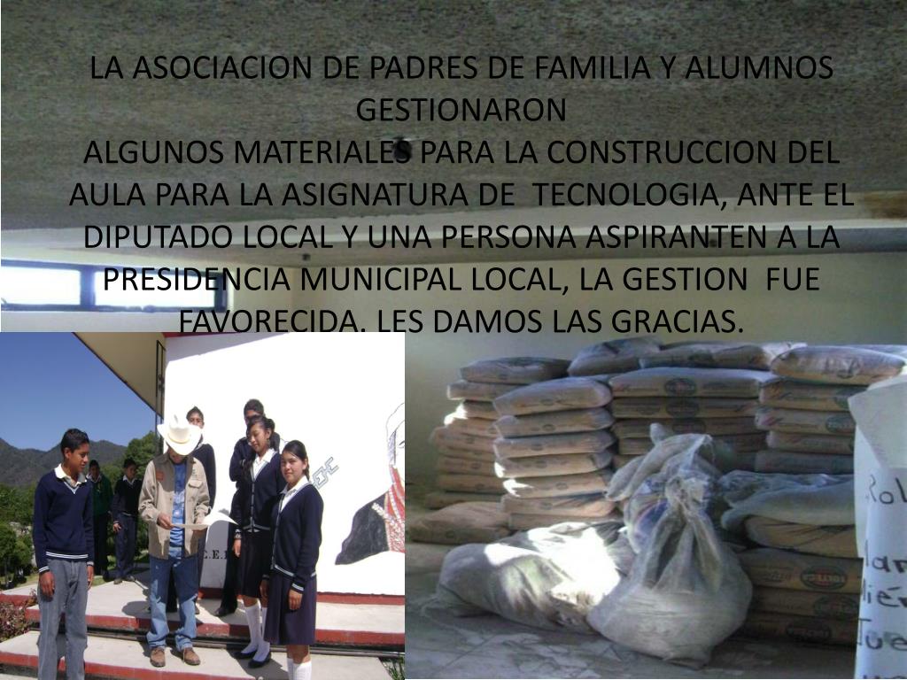 LA ASOCIACION DE PADRES DE FAMILIA Y ALUMNOS GESTIONARON ALGUNOS MATERIALES PARA LA CONSTRUCCION DEL AULA PARA LA ASIGNATURA DE TECNOLOGIA, ANTE EL DIPUTADO LOCAL Y UNA PERSONA ASPIRANTEN A LA PRESIDENCIA MUNICIPAL LOCAL, LA GESTION FUE FAVORECIDA. LES DAMOS LAS GRACIAS.