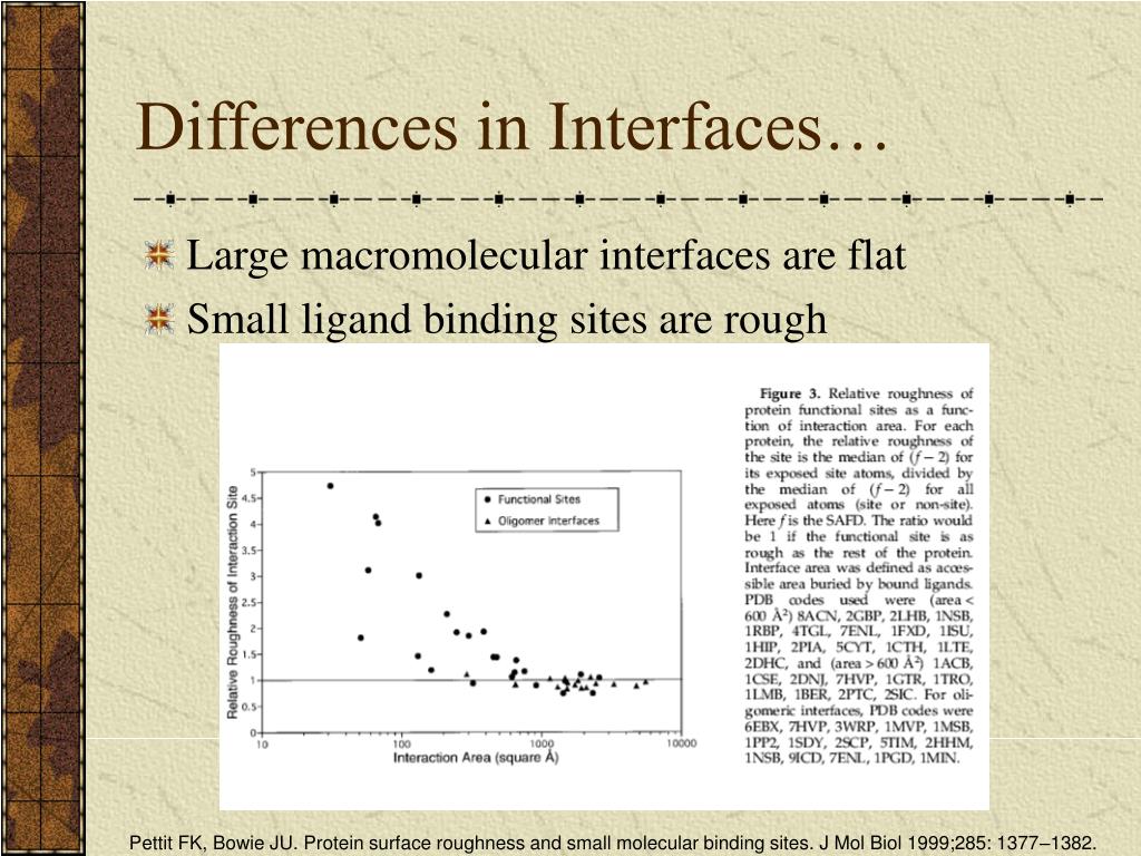 Differences in Interfaces… • Large macromolecular interfaces are flat • Small ligand binding sites are rough Pettit FK, Bowie JU. Protein surface roughness and small molecular binding sites. J Mol Biol 1999;285: 1377–1382.