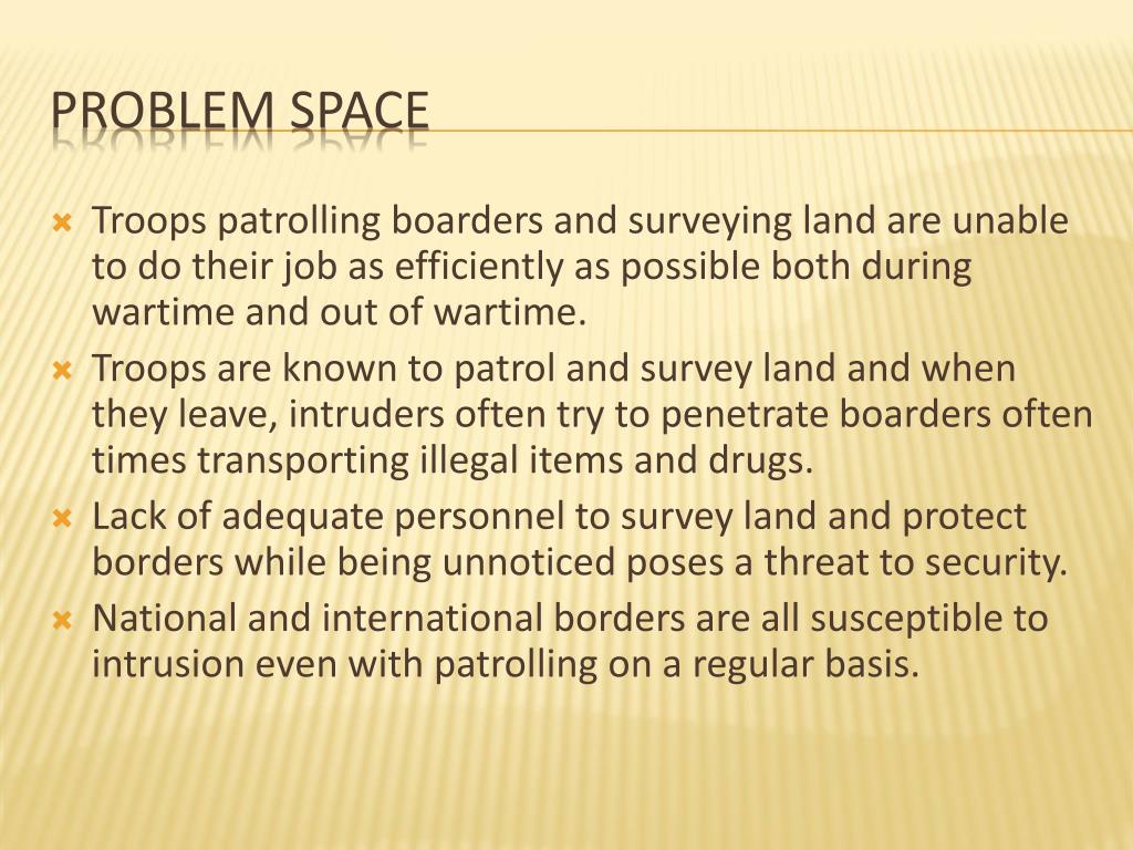 Troops patrolling boarders and surveying land are unable to do their job as efficiently as possible both during wartime and out of wartime. Troops are known to patrol and survey land and when they leave, intruders often try to penetrate boarders often times transporting illegal items and drugs. Lack of adequate personnel to survey land and protect borders while being unnoticed poses a threat to security. National and international borders are all susceptible to intrusion even with patrolling on a regular basis. Problem Space