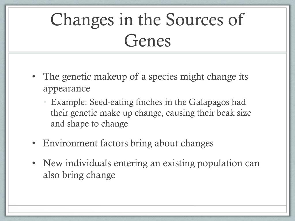 Changes in the Sources of Genes • The genetic makeup of a species might change its appearance • Example: Seed-eating finches in the Galapagos had their genetic make up change, causing their beak size and shape to change • Environment factors bring about changes • New individuals entering an existing population can also bring change