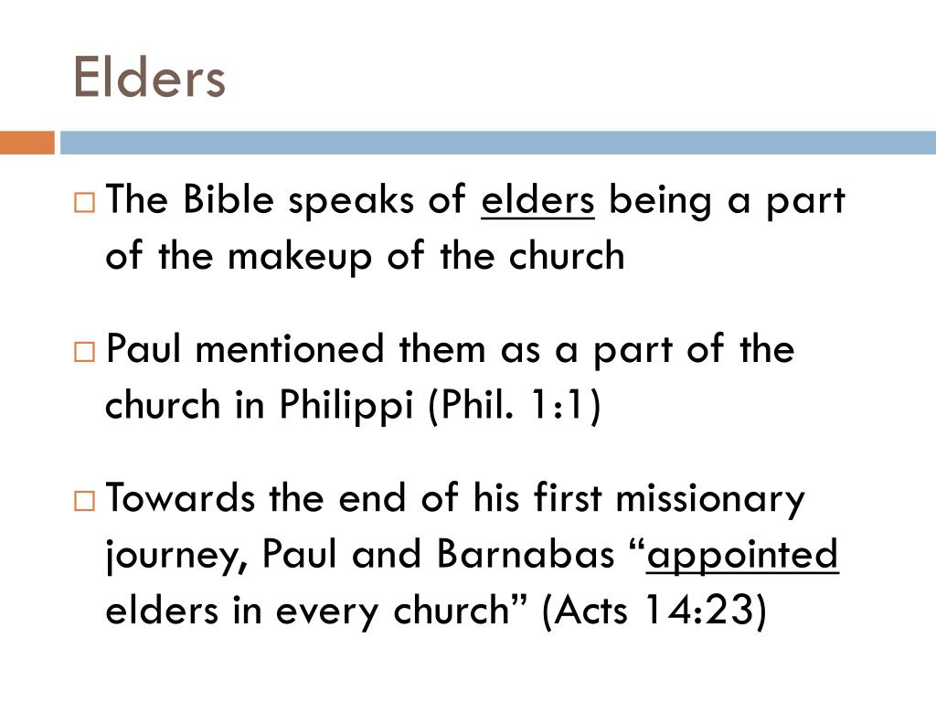 Elders • The Bible speaks of elders being a part of the makeup of the church • Paul mentioned them as a part of the church in Philippi (Phil. 1:1) • Towards the end of his first missionary journey, Paul and Barnabas “appointed elders in every church” (Acts 14:23)