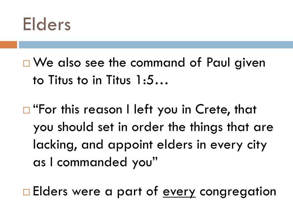 Elders • We also see the command of Paul given to Titus to in Titus 1:5… • “For this reason I left you in Crete, that you should set in order the things that are lacking, and appoint elders in every city as I commanded you” • Elders were a part of every congregation