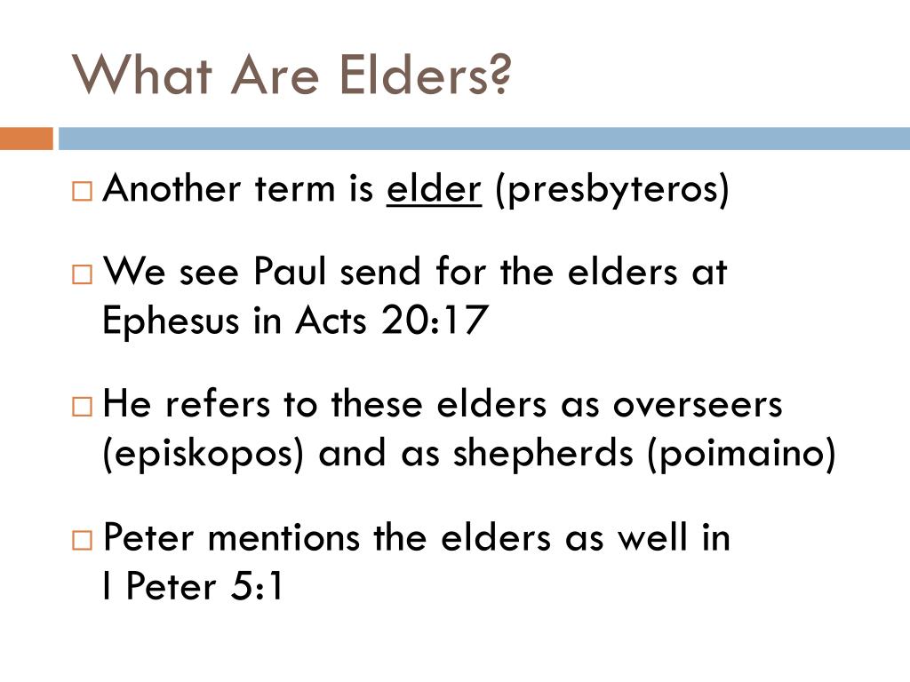 What Are Elders? • Another term is elder (presbyteros) • We see Paul send for the elders at Ephesus in Acts 20:17 • He refers to these elders as overseers (episkopos) and as shepherds (poimaino) • Peter mentions the elders as well inI Peter 5:1