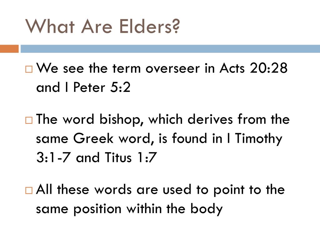 What Are Elders? • We see the term overseer in Acts 20:28 and I Peter 5:2 • The word bishop, which derives from the same Greek word, is found in I Timothy 3:1-7 and Titus 1:7 • All these words are used to point to the same position within the body