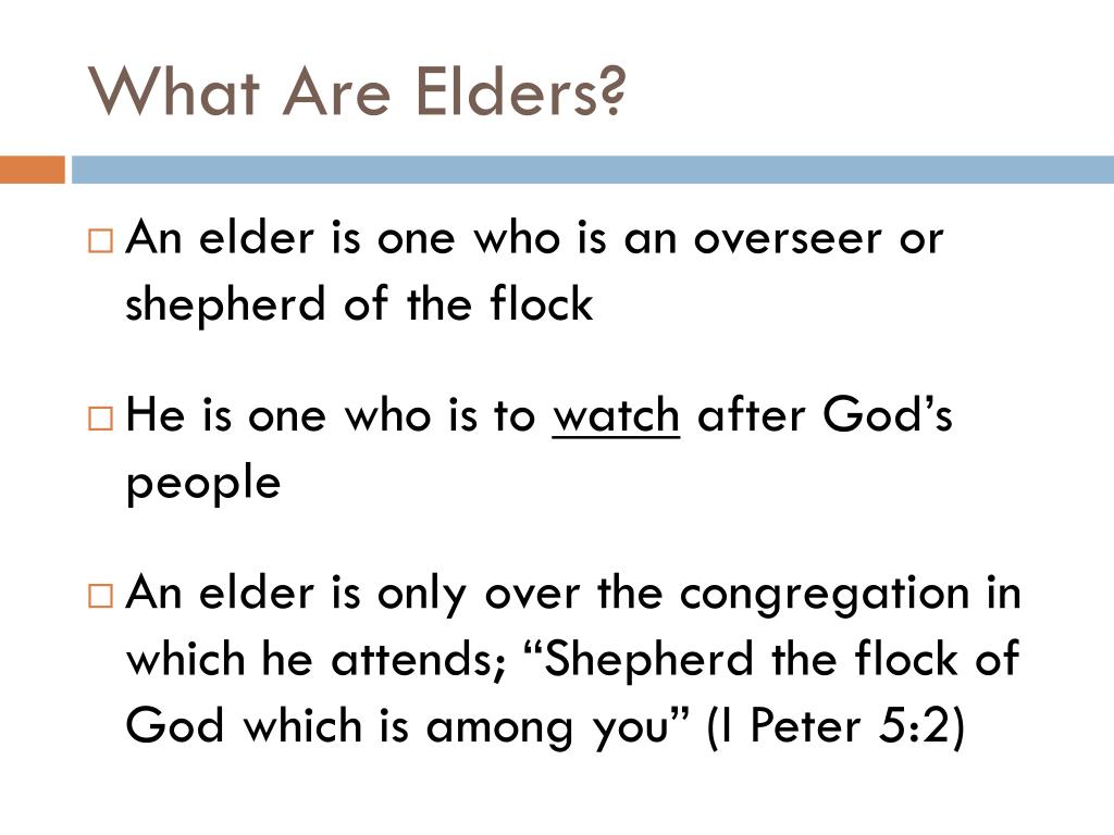 What Are Elders? • An elder is one who is an overseer or shepherd of the flock • He is one who is to watch after God’s people • An elder is only over the congregation in which he attends; “Shepherd the flock of God which is among you” (I Peter 5:2)