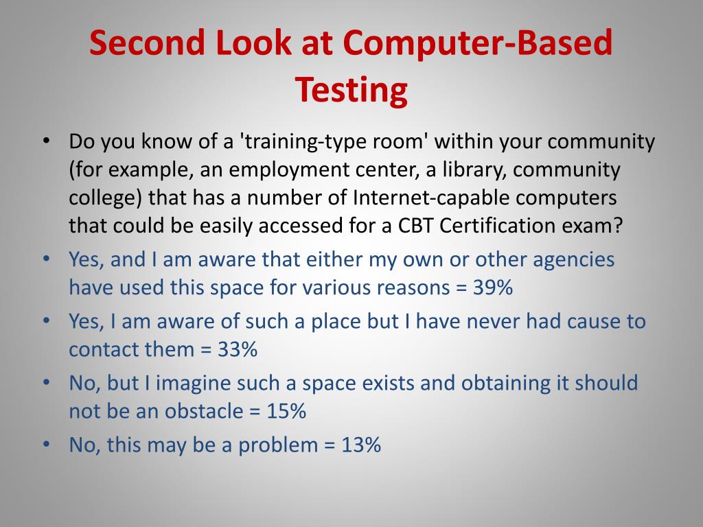 Second Look at Computer-Based Testing • Do you know of a 'training-type room' within your community (for example, an employment center, a library, community college) that has a number of Internet-capable computers that could be easily accessed for a CBT Certification exam? • Yes, and I am aware that either my own or other agencies have used this space for various reasons = 39% • Yes, I am aware of such a place but I have never had cause to contact them = 33% • No, but I imagine such a space exists and obtaining it should not be an obstacle = 15% • No, this may be a problem = 13%