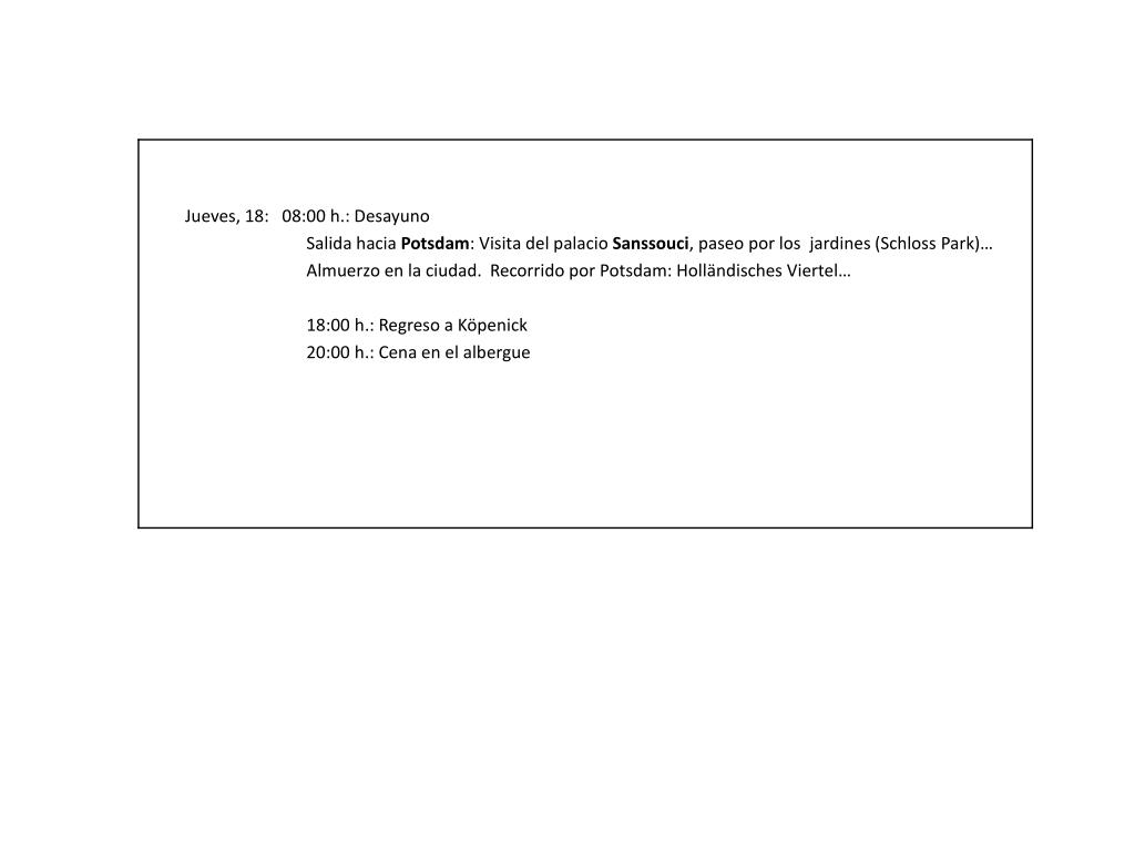 Jueves, 18: 08:00 h.: Desayuno Salida hacia Potsdam: Visita del palacio Sanssouci, paseo por los jardines (Schloss Park)… Almuerzo en la ciudad. Recorrido por Potsdam: Holländisches Viertel… 18:00 h.: Regreso a Köpenick 20:00 h.: Cena en el albergue