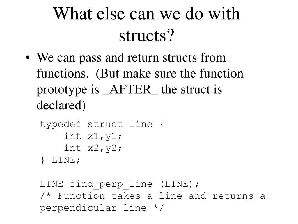 What else can we do with structs? • We can pass and return structs from functions. (But make sure the function prototype is _AFTER_ the struct is declared) typedef struct line { int x1,y1; int x2,y2; } LINE; LINE find_perp_line (LINE); /* Function takes a line and returns a perpendicular line */