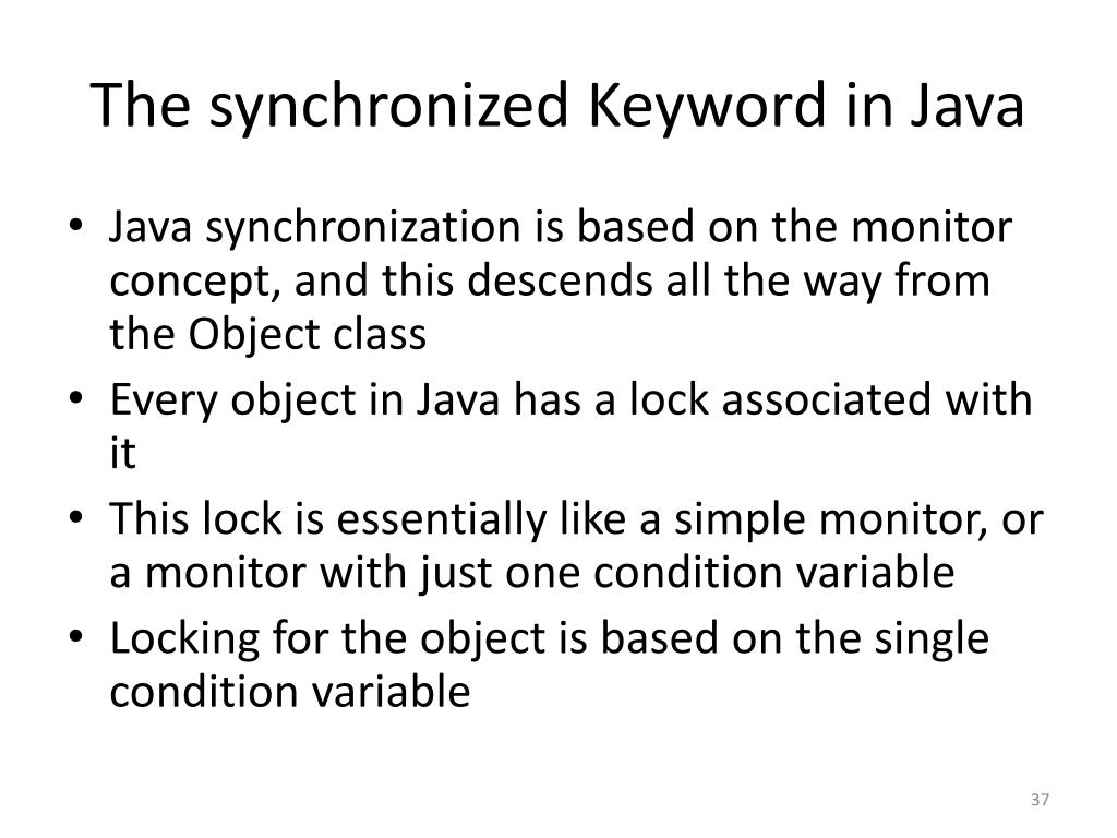 The synchronized Keyword in Java • Java synchronization is based on the monitor concept, and this descends all the way from the Object class • Every object in Java has a lock associated with it • This lock is essentially like a simple monitor, or a monitor with just one condition variable • Locking for the object is based on the single condition variable